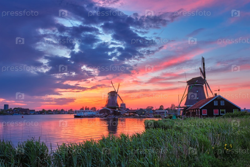 Ветряные мельницы в Заансе-Шанс в Голландии на закате