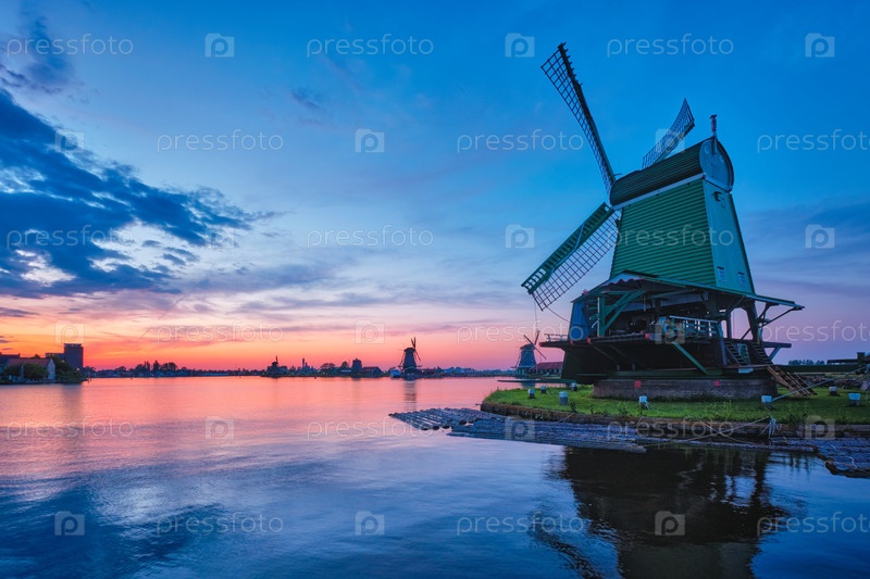 Ветряные мельницы на знаменитом туристическом объекте Заансе-Шанс в Голландии с драматическим небом