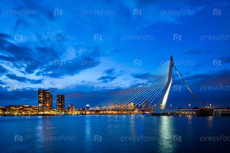 Вид на мост Эразмусбруг и городской пейзаж Роттердама, освещенный ночью