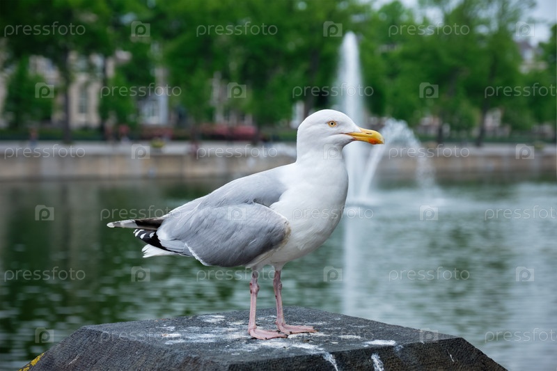 Белая чайка сидит возле озера Хофвайвер с фонтаном
