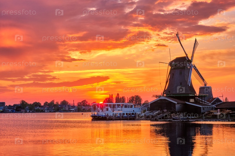 Ветряные мельницы в Заансе-Шанс в Голландии на закате