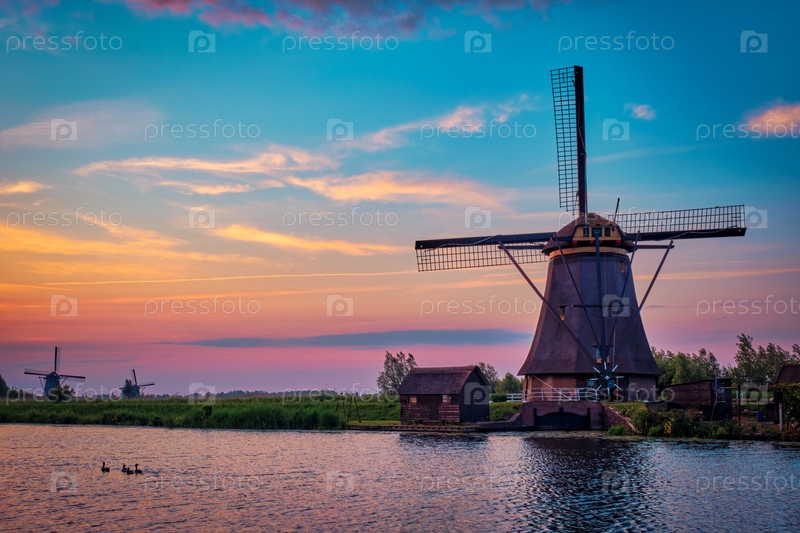Голландский сельский пейзаж с ветряными мельницами на знаменитом туристическом месте Kinderdijk в Нидерландах при закате солнца с драматическим небом