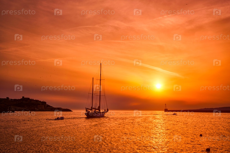 Шхуна в порту Марселя при закате солнца.Марсель, Франция