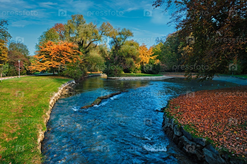 Золотая осень октября в знаменитом Мюнхенском месте отдыха - Англичангартене.Английский сад с рекой и упавшими листьями и золотым солнечным светом.Мюнхен, Бавария, Германия