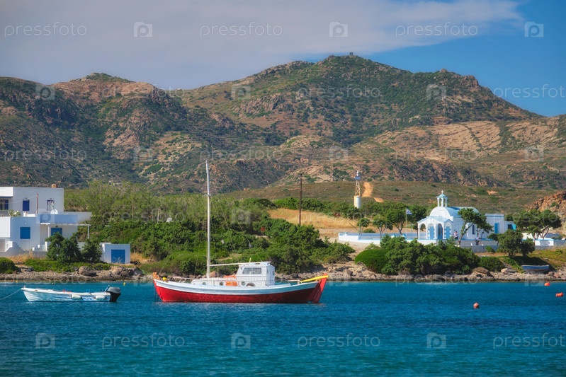 Пляж и рыбацкая деревня Поллония с рыболовными лодками в море и церковью