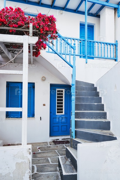 Живописная узкая улица с традиционными белыми домами с цветущими бугенвильскими цветами города Науза в знаменитой туристической достопримечательности острова Парос, Греция