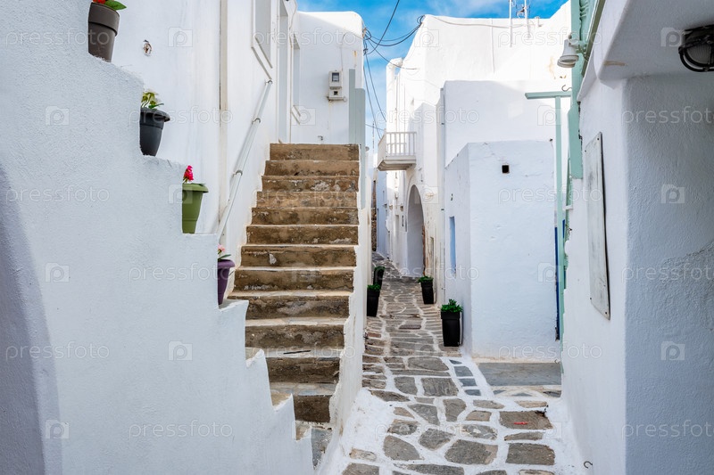 Живописная узкая улица с традиционными белыми домами города Науза в знаменитой туристической достопримечательности острова Парос, Греция