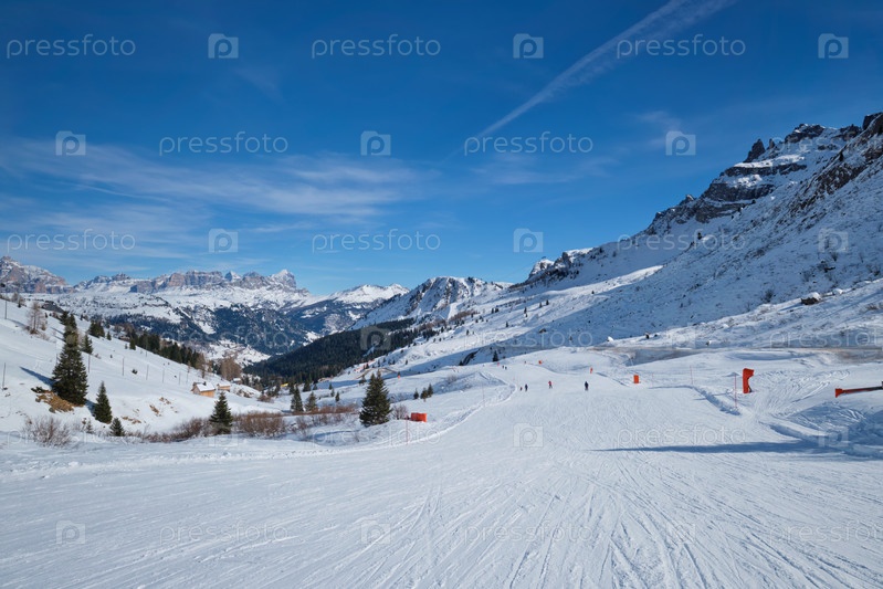 Вид на горнолыжный курорт поет с людьми, катающимися на лыжах в Доломитах в Италии