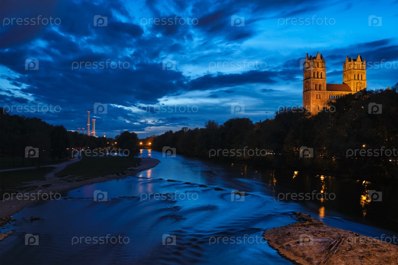 Тип Мюнхена - река Изар, парк и Черково Святое Максимилиана с мостом Рейхенбах в Сумераке