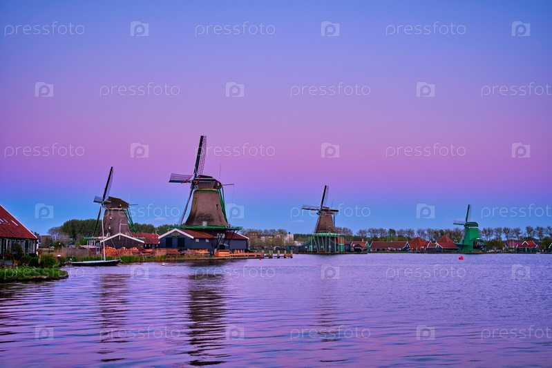 Ветряные мельницы на знаменитом туристическом объекте Заансе-Шанс в Голландии после захода солнца