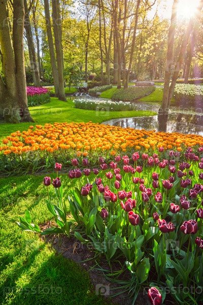 Цветочный сад Кеукенхофа с клумбой тюльпанов является одним из крупнейших в мире цветочных садов на закате.Lisse, Нидерланды