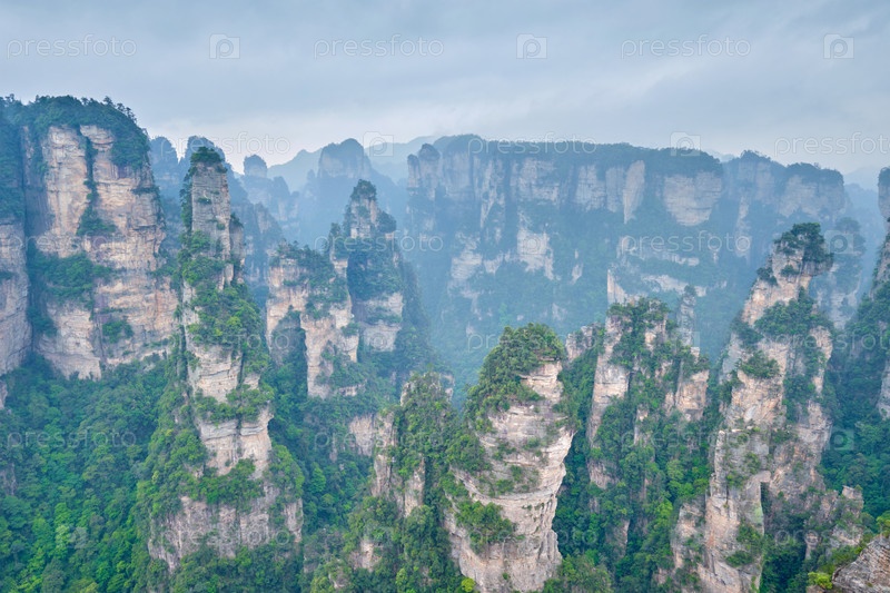 Известная туристическая достопримечательность Китая - каменные столбы скальных гор Чжанцзянджи в туманных облаках во Вулингюане, провинция Хунань, Китай