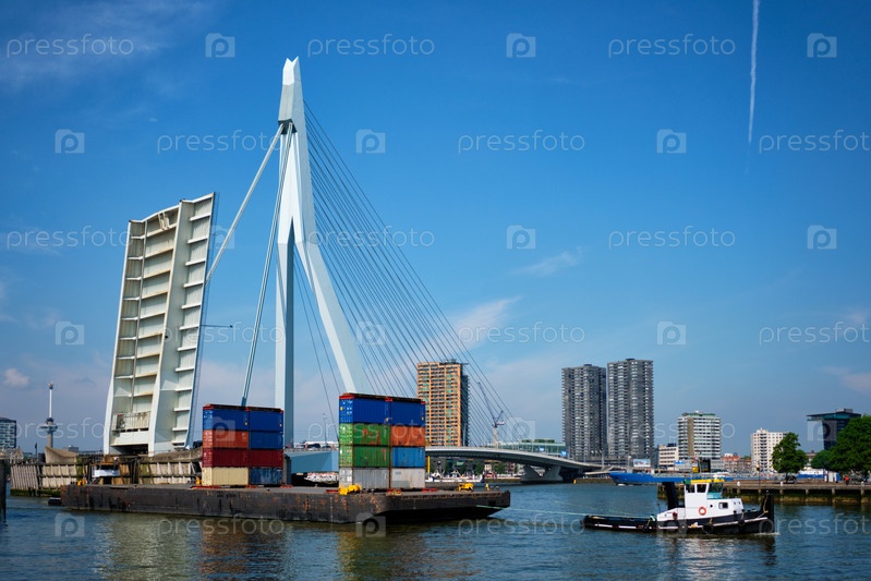 Буксирующая баржа с контейнерами под открытой базальной частью моста Erasmusbrug