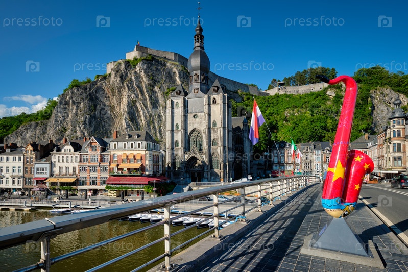 Живописный город Динан, Цитадель Динан и Коллегиальная церковь Нотр-Дам де Динан и мост Карла де Голля с саксофонами, так как Динан является родным городом изобретателя саксафонов и флагов