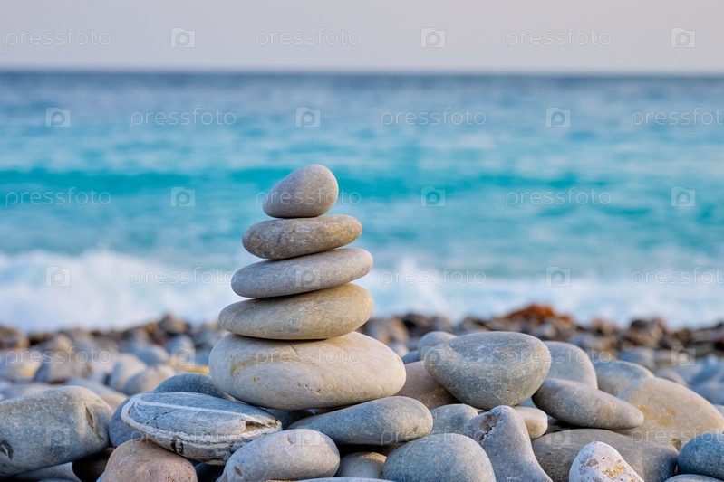 Концепция релаксации дзен-медитации сбалансированные камни, наложенные рядом с морским пляжем