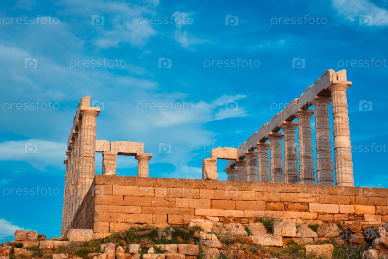 Руины храма Посейдона на мысе Сунио при закате солнца, Греция