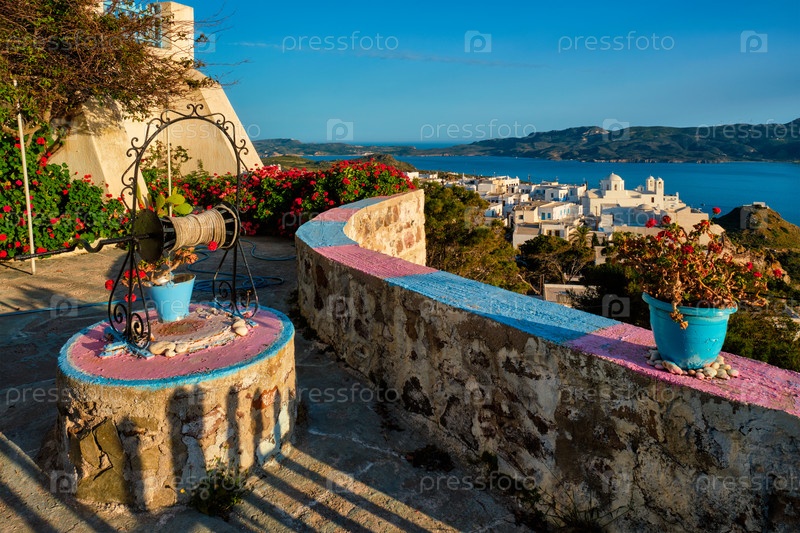 Живописный вид на греческий город Плака на острове Милос над красными цветами геранима