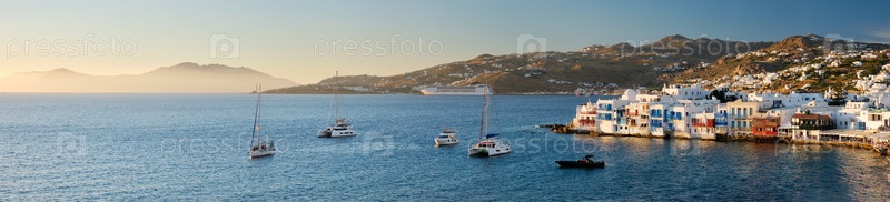 Закат солнца на Миконосе, Греция с круизным кораблем и яхтами в гавани