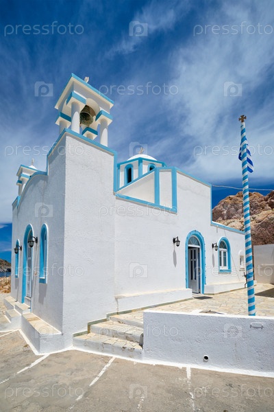 Живописный вид на греческую деревню в Греции - православная церковь в рыбацкой деревне Фирапотамос на острове Милос, Греция