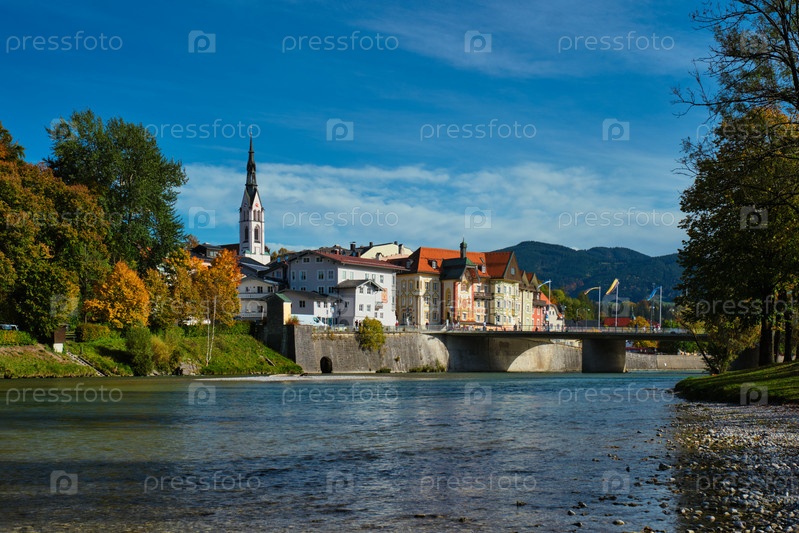 Вид на Бад-Толц - живописный курортный город в Баварии, Германия осенью и реку Исар