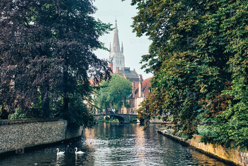 Канал Брюгге с белыми лебедями среди старых деревьев со церковью Богоматери на заднем плане