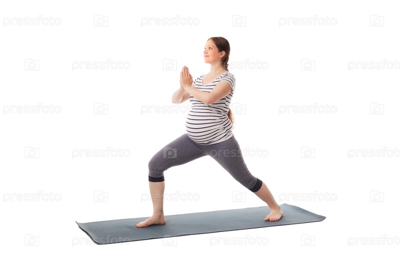 Йога-упражнения для беременных женщин, выполняющих асаны вирабхадрасана 1 - позы воина изолированные на белом фоне