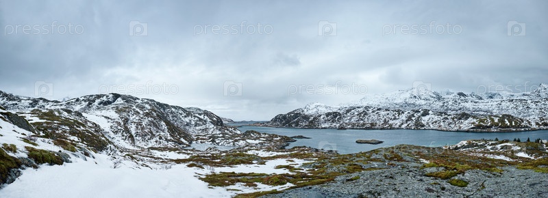 Панорама норвежского фьорда зимой, Острова Лофотен Норвегия