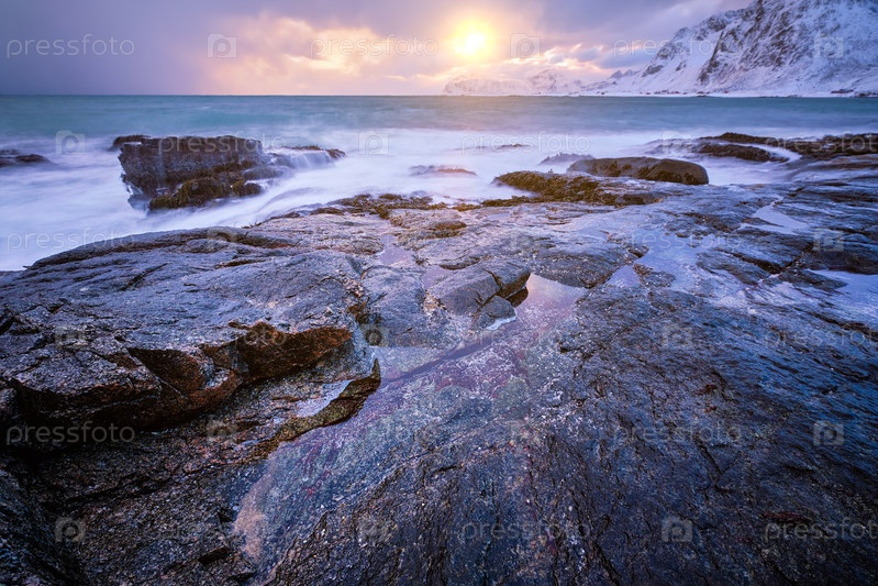 Побережье Норвежского моря на скалистом побережье в фьорде при закате солнца