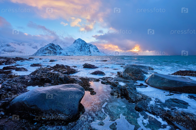 Пляж Норвежского моря на скалистом побережье в фьорде при закате солнца зимой