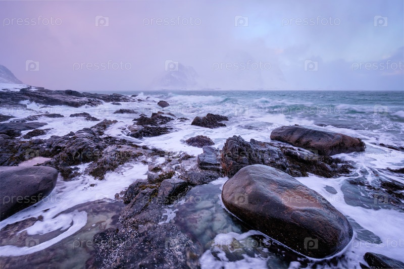 Пляж Норвежского моря на скалистом побережье в фьорде при закате солнца зимой