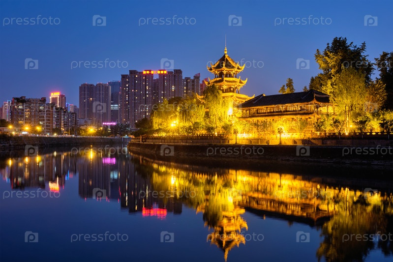 Павильон Ванцзян (Парк Ванцзянлу) Вид на реку Цзиньцзян, Чэнду, Сичуань, Китай освещен ночью