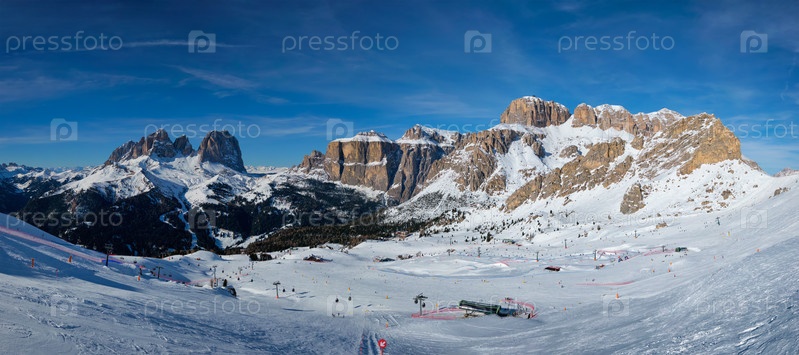 Панорама горнолыжного курорта Pit с людьми, катающимися на лыжах в Доломитах в Италии. лыжная зона Belvedere. Канасей, Италия