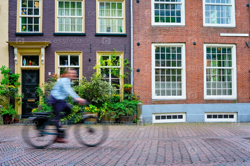 Человек на велосипеде - очень популярное средство передвижения в Нидерландах на улице со старыми домами Дельфта, Нидерланды