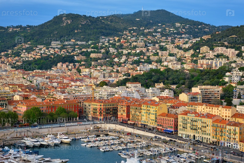 Вид на Старый порт Ниццы с роскошными яхтами из Касл-Хилла, Франция, Villefranche-sur-Mer, Ницца, Лазурный берег, Французская Ривьера