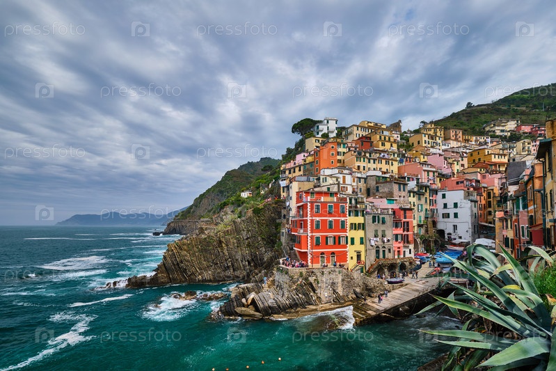 Деревня Риомаджоре - популярное туристическое направление в Национальном парке Цинк-Терре, объекте Всемирного наследия ЮНЕСКО, Лигурия, Италия в бурную погоду