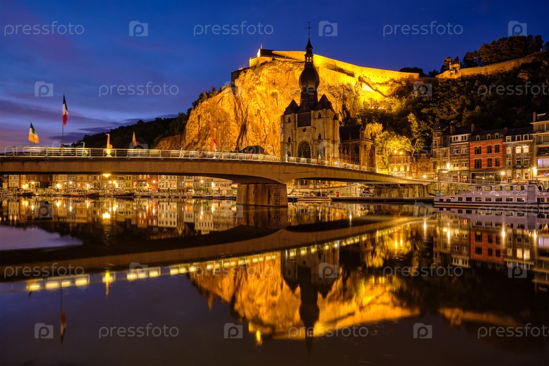 Ночные виды на город Динан, университетскую церковь Нотр-Дам де Динан над рекой Мауза и мост Шарля де Голля и Цитадель Динан освещаются вечером