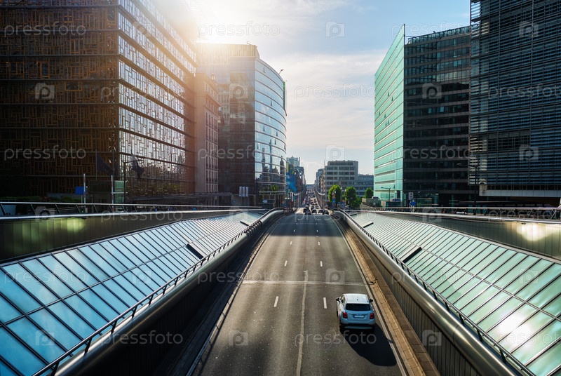Уличный трафик в Брюсселе за пределами здания Европейской комиссии на закате