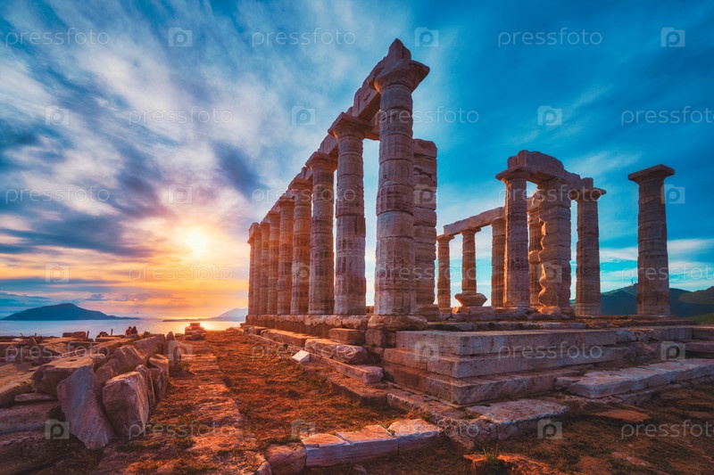 Руины храма Посейдона на мысе Сунио при закате солнца, Греция