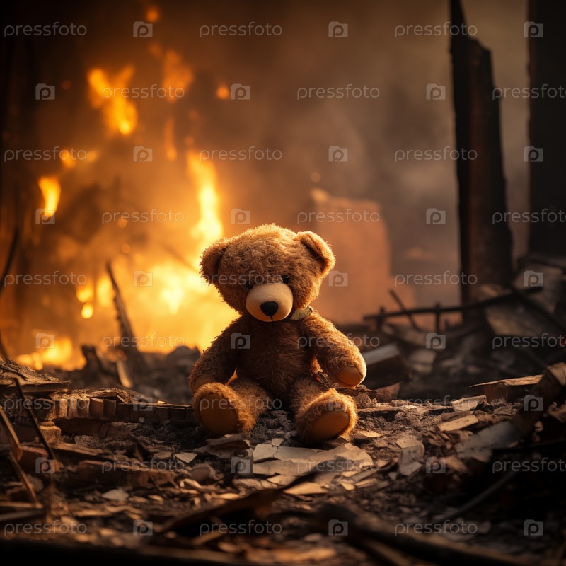Концепция трагедии детей войны - печальный плюшевый медведь, оставленный в руинах разрушенного во время войны дома