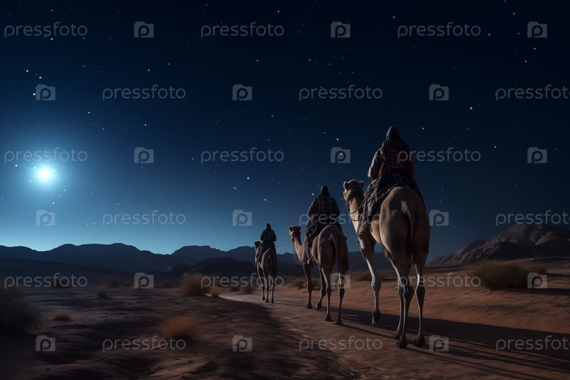 Рождественская концепция рождения Иисуса - Поклонение волхвам, трем мудрецам, трем царям и трём библейским волшебникам с силуэтами верблюдов, путешествующих по песчаным дюнам пустыни, следует за звездой Вифлеема ночью