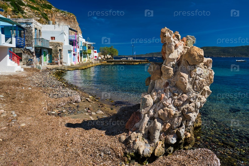 Живописная греческая рыбацкая деревня Клима с белыми традиционными домами и красочными окнами и дверями на острове Милос в Греции