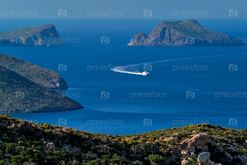 Скоростной катер катамаран паромная лодка в Эгейском море недалеко от острова Милос летом