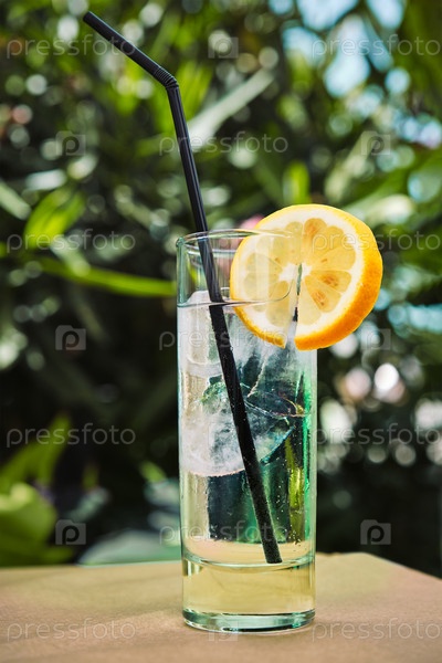 Коктейль ген-тоник с лимоном и соломой на столе в кафе