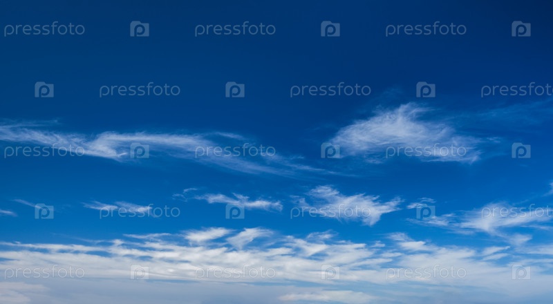 Голубое ясное небо с белыми цирковыми вращающимися облаками