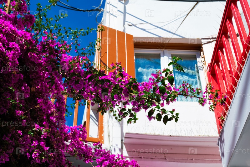 Бугенвильский цветок с греческим традиционным домом на заднем плане в деревне Хора, остров Миконос, Греция
