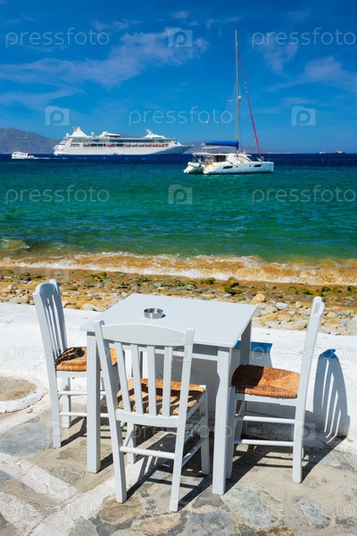 Туристическая греческая сцена - это прибрежный ресторан-кафе стол с катамаранской яхтой и круизным лайнером и Эгейским морем на заднем плане в красивый летний день.Хора, остров Миконос, Греция