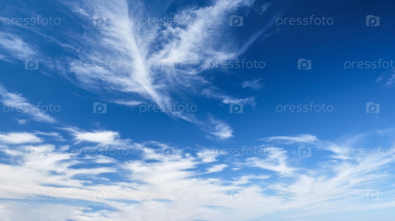 Голубое ясное небо с белыми цирковыми вращающимися облаками