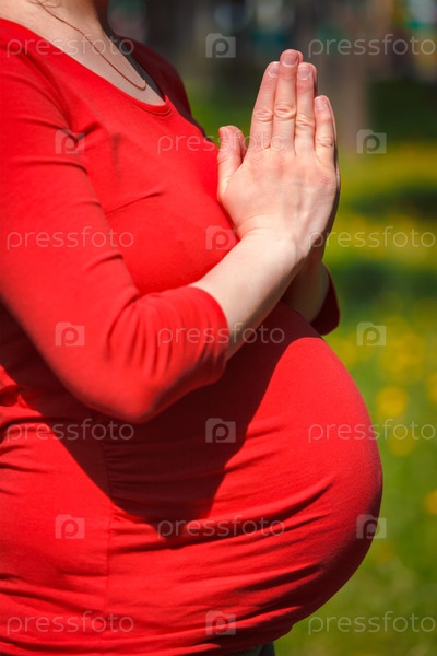 Упражнения йоги во время беременности - Беременная женщина Dos Asana Tadasana Namaste - Горная поза с приветствиями на открытом воздухе на травяной газоне с магдалонами летом