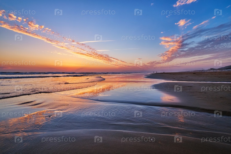 Закат Атлантического океана с бурными волнами на пляже Фонте-да-Теля, Португалия