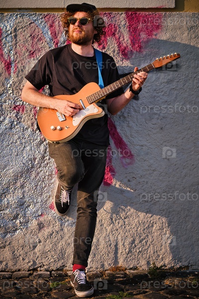 Уличный музыкант-хипстер в черном играет на электрической гитаре снаружи при закате, опираясь на стену